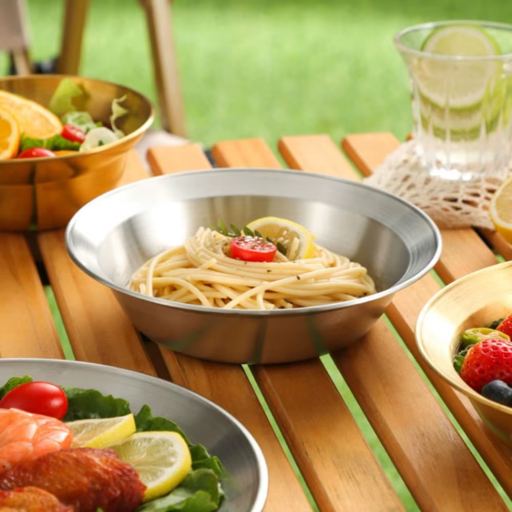 في الرحلات والتخييم أو حتى في الشغل، أحلى إحساس إنك بتاكل في “طبق محترم” مش أطباق بلاستيك بتكسر أو تمسك ريحة. الطقم الستانلس ده بيدي إحساس نظافة وترتيب، وبيخلّي الأكل أحلى لأن التقديم نفسه شيك ومريح—وبعدها غسلة سريعة وخلاص.
